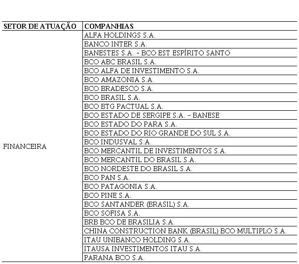 Dessa forma, este estudo tem como universo de pesquisa as instituições financeiras pertencentes à Brasil, Bolsa, Balcão (B3), totalizando 26 instituições. A amostra vai ser composta por acessibilidade, tendo em vista que as instituições selecionadas precisam apresentar com realismo os custos de agência e um detalhamento de informações acerca das demonstrações contábeis para atingir os objetivos. Foi contemplado o período de 2014 a 2018, ou seja, foram verificadas as influências da estrutura de propriedade nos custos de agência nesses 5 anos. O conjunto completo das instituições financeiras conforme listadas na B3 está representado na Tabela 1.