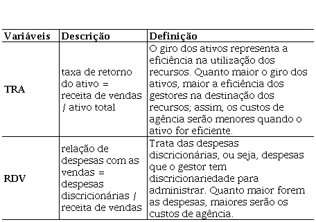 · Taxa de retorno sobre o ativo (TRA), que representa a receita de vendas dividida pelo ativo total. Ela evidencia o giro dos ativos das empresas; ou seja, quanto maior o giro do ativo, maior a eficiência na gestão das companhias, e menores os custos de agência;