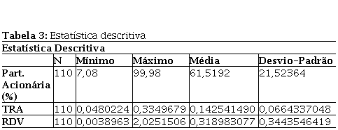 Além disso, entre o coeficiente de correlação 0,380 da RDV e o da participação acionária, observa-se que as variáveis não apresentam parâmetros significativos. À vista disso, o controle acionário das empresas em estudo, apesar de demonstrar uma discrepância considerável em relação a seus valores mínimos e máximos de controle (7,08 e 99,98), conforme visto na Tabela 2, não reflete relação direta com a RDV.