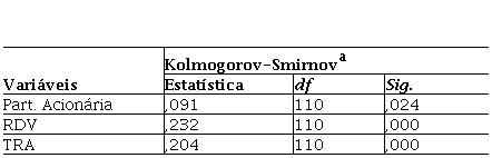Assim, a fim de avaliar se os dados específicos seguem ou não uma distribuição normal, o teste realizado verificou a relação dos dados e a significância da participação acionária de 0,24, e as variáveis RDV e TRA apresentaram valores iguais a 0,0. Portanto, não há como fazer uma análise da normalidade dos dados, tendo em vista que a significância foi menor que 5%, ferindo um dos pressupostos da regressão. Ou seja, indica-se a excursão de um teste não paramétrico.
