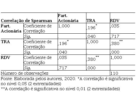 Por outro lado, a segunda correlação, entre a participação acionária e a RDV, não apresentou parâmetros significativos – ao contrário das variáveis RDV e TRA, que revelam relação significativa, verificando-se que, quanto maior o retorno do ativo, maiores as despesas discricionárias, e, portanto, maiores os custos de agência. Assim, foi rejeitada a hipótese 1, tendo em vista que, quanto maior a participação acionária, melhores são as aplicabilidades dos ativos e menores os custos de agência. Além disso, de acordo com a correlação de Spearman, a participação acionária e a RVD não apresentam parâmetros significativos.