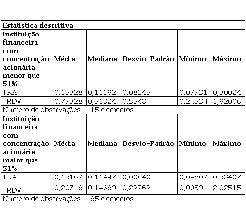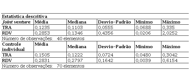 Quanto à análise das instituições financeiras que caracterizam joint venture (controle compartilhado), verifica-se na Tabela 6 que a variável TRA alcança média de 0,1235, mediana de 0,1103 e desvio-padrão de 0,0555. Por sua vez, as empresas com controle individual (concentrado) apresentam média de 0,1505, mediana de 0,1222 e desvio-padrão de 0,0724.