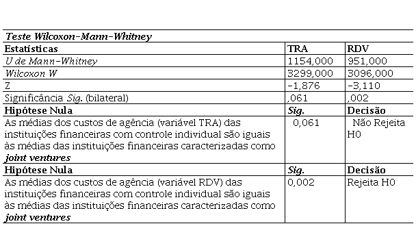 A respeito da variável RDV, de acordo com Tabela 6, observa-se que as instituições joint ventures alcançaram média de 0,2853, mediana de 0,1346 e desvio-padrão de 0,4356. Em contrapartida, as empresas com controle individual indicam média de 0,2831, mediana de 0,2797 e desvio-padrão de 0,1642. Dessa maneira, os resultados obtidos apontam que, apesar de possuírem médias similares e pequenas diferenças na mediana e no desvio-padrão, as instituições joint ventures contam com maior custo de agência. Isso caracteriza uma menor eficiência, representando maiores despesas discricionárias na gestão.
