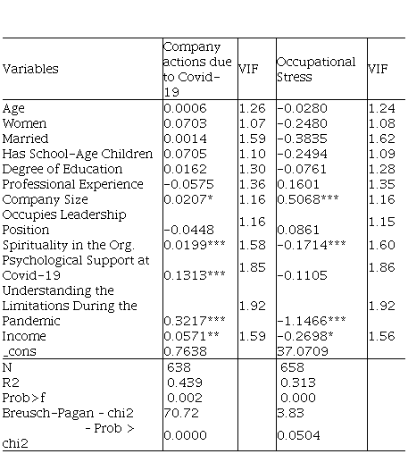 In the second model, occupational stress during the pandemic was analyzed. The only statistically significant and positive variable was the size of the company, that is, the larger the company, the greater the respondent's occupational stress. It is well known that large companies generally have systems more focused on goals and with greater pressure for results, which can contribute to greater stress at work. Besides that, the fear of mass layoffs in large companies may also have influenced with occupational stress. The other significant variables were negative, namely: Age, Spirituality in the Organization, Being Understandable during the Pandemic and Income. The presence of these items reduces the participant's occupational stress. The variable related to Being Understandable during the Covid-19 crisis acting as a stress reliever is quite logical in its composition, since this behavior leaves employees feeling more secure and welcoming by their organizations.