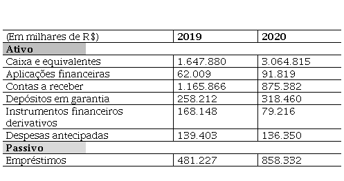 Quanto ao passivo, a conta “empréstimos” teve ligeira redução, com um total de 2.543.039 em 2019 e 2.353.279 em 2020.