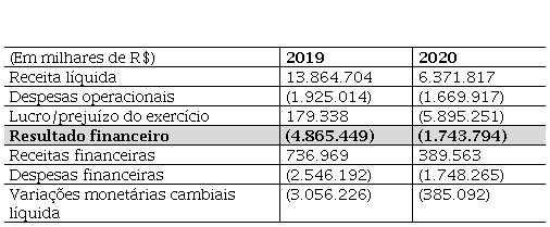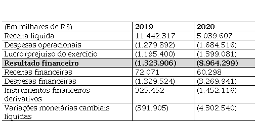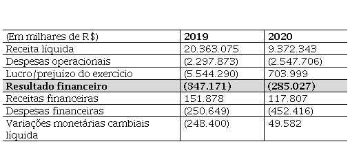 Apesar do resultado financeiro negativo ter uma considerável redução: –4.865.449 em 2019, passando para –1.743.794 em 2020, o que desperta preocupação é a redução do resultado do exercício: a empresa operou com lucro de 179.338 em 2019 e alcançou um prejuízo de –5.895.251 em 2020.