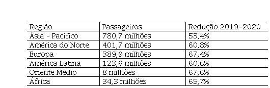 · De 69% da receita total de passageiros para US$ 189 bilhões em 2020, com perdas líquidas de US$ 126,4 bilhões no total.