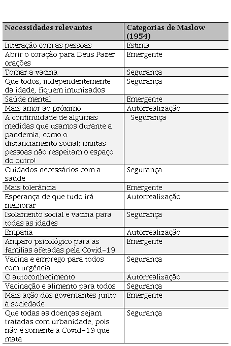 Com base na opinião dos participantes, os resultados demonstraram a necessidade de valorização de sentimentos altruístas e atitudes de maior proximidade entre as pessoas. A descrição fornecida contempla a abordagem da Teoria das Necessidades de Maslow segundo a escala de autorrealização. Trata-se, pois, de uma manifestação altamente positiva para um contexto de medo, ansiedade e incertezas futuras.