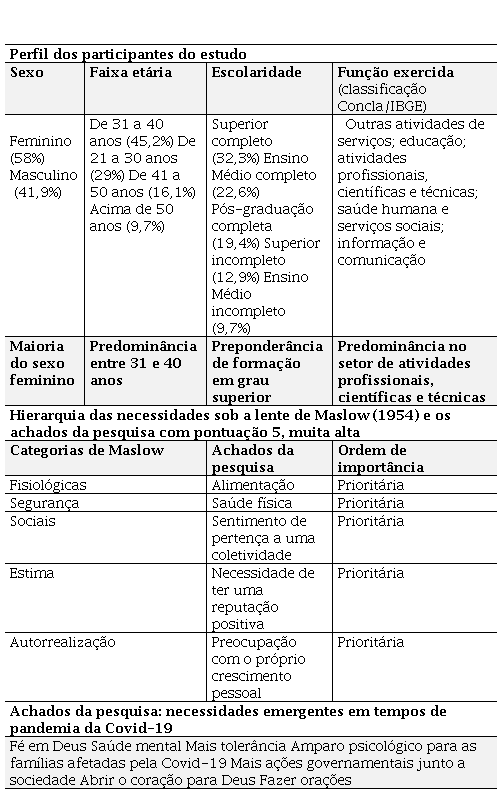 Considerando a perspectiva de Maslow (1954) quanto à necessidade de segurança, vê-se ampliado, a partir dos dados coletados, o espectro para a inclusão do item saúde física com a maior pontuação associada às implicações da Covid-19.