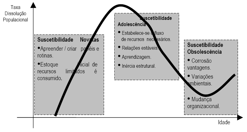 As pesquisas em ecologia que tratam da relação entre idade e mortalidade (HANNAN, 1998; CARROLL; HANNAN, 2000) apontam três tipos de suscetibilidade: suscetibilidade das novatas (FREEMAN et al., 1983; HANANN; FREEMAN, 1984); suscetibilidade da adolescência (BRÜDERL; SCHUSSLER, 1990; FICHMAN; LEVINTHAL, 1991; CARROLL; HANNAN, 2000); e suscetibilidade da velhice ou obsolescência (BARRON et al., 1994; CARROLL; HANNAN, 2000).