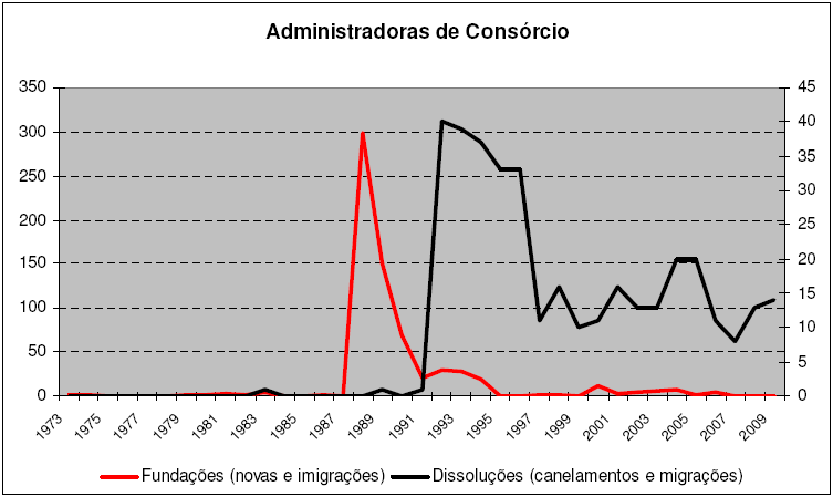 O Quadro 3 apresenta esquematicamente um breve histórico das mudanças ambientais na população de administradoras de consórcio e os impactos sobre o nascimento e a morte das empresas que nele atuam.