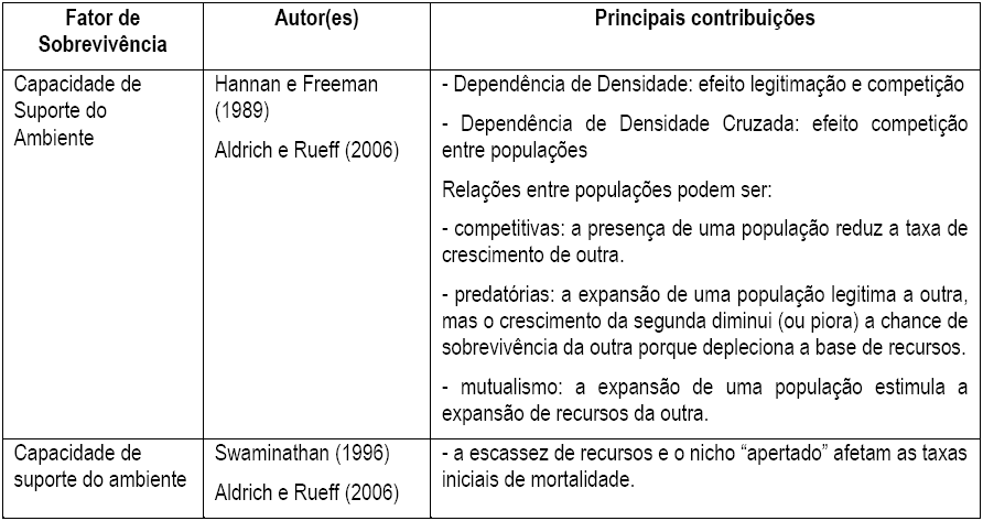 Em geral, na perspectiva da Ecologia Populacional, a probabilidade de sobrevivência depende da capacidade de suporte do ambiente e dos eventos que modificam o nível de seleção, do alinhamento entre a natureza do ambiente e a estratégia da firma (generalista ou especialista), da idade e da habilidade da firma de perceber as oportunidades.