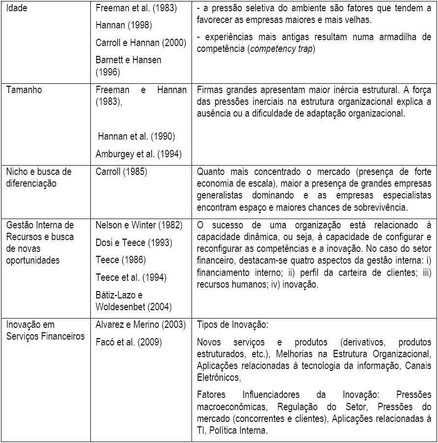 A sobrevivência organizacional é analisada neste artigo a partir desta perspectiva multinível do processo de seleção, na qual se incluem fatores externos e internos à empresa. No Quadro 1 são apresentados estes fatores, com os principais autores de referência, e as respectivas proposições (ou hipóteses).