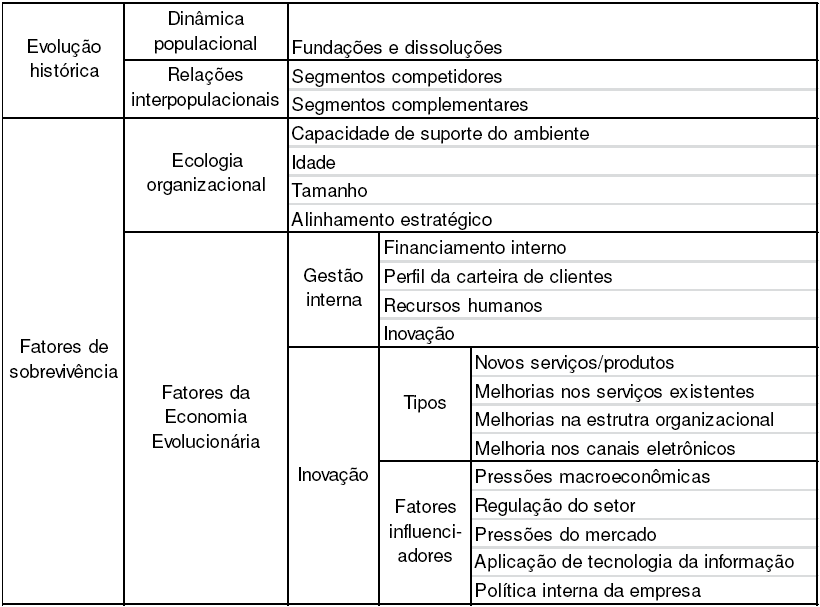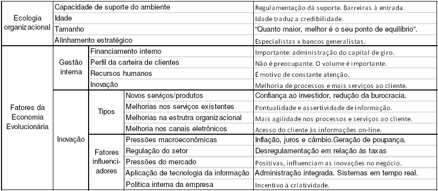 O segundo bloco envolveu os fatores de sobrevivência, tanto na perspectiva externa quanto interna à organização. Neste caso as categorias analisadas incluíram tanto os fatores de sobrevivência apontados pela Ecologia Organizacional (capacidade de suporte do ambiente, idade, tamanho e alinhamento estratégico), quanto os fatores apontados pela Economia Evolucionária, ligados à gestão interna e à inovação.