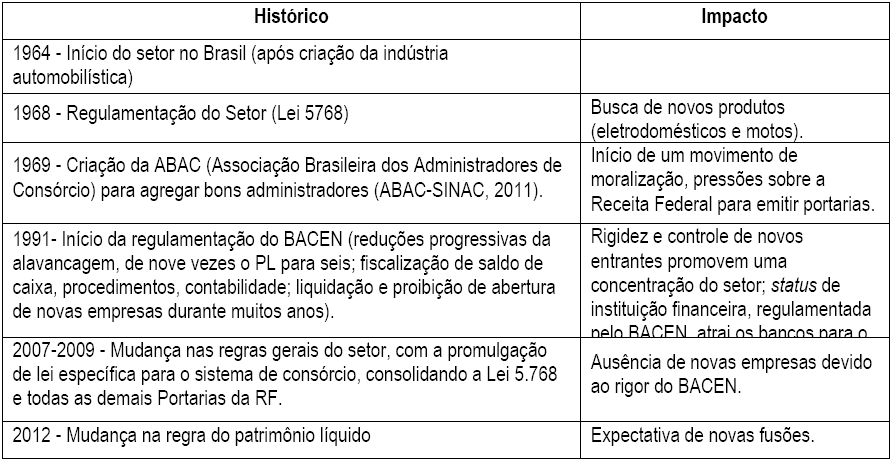 Três importantes fatores se destacam na importância de se compreender a dinâmica de sobrevivência dessas instituições. Em primeiro lugar, é um setor com formato único de cooperativismo voltado para o consumo, uma experiência genuinamente brasileira. De acordo com a Associação Brasileira de Administradoras de Consórcio (ABAC), a partir da criação desta modalidade de financiamento no Brasil em meados da década de 60, vários países latino-americanos também decidem iniciar essa atividade, como Argentina, Uruguai, Paraguai, Peru, México e Venezuela. Em segundo lugar, é um segmento sujeito a leis e normas similares às aplicadas à atividade bancária. Apesar do efeito legitimador que essa regulamentação promove, há, por outro lado, uma série de exigências por parte do Banco Central as quais tornam a atuação no setor um desafio para instituições de pequeno porte, notadamente custos de manutenção de patrimônio elevado. E, em terceiro, são instituições que concorrem com grandes bancos, especificamente bancos múltiplos, com uma ampla base de clientes correntistas, competindo, portanto, na captação de clientes, já que as administradoras de consórcio não gozam da prerrogativa dos bancos de movimentação de contas correntes.