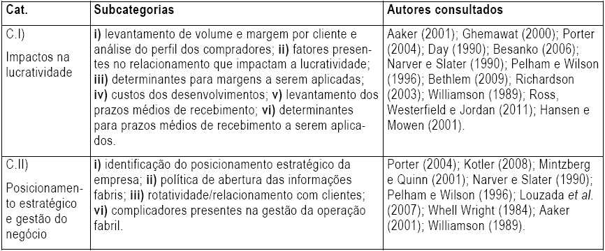 No que tange à pesquisa interna na Alpha, a categorização segue a proposição mostrada no Quadro 1 a partir dos autores citados. Com relação a categorias analíticas da pesquisa qualitativa, Lüdke e André (1986) ressaltam que não há um conjunto de regras padrão para sua criação. Para os autores, as categorias surgem inicialmente da teoria em que se apoia a investigação. Os dados que não puderem ser agregados nesta primeira categorização devem ser classificados em um grupo à parte de acordo com os objetivos específicos do pesquisador (LÜDKE; ANDRÉ, 1986).