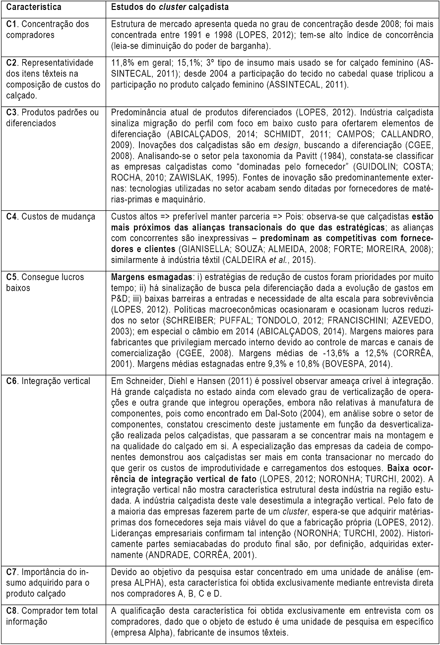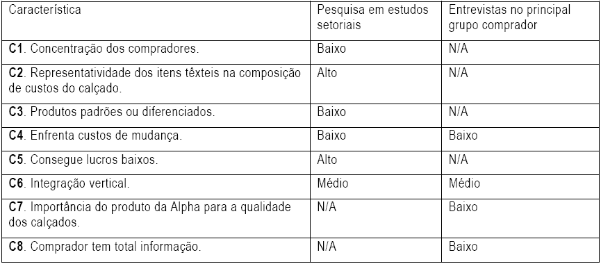 Norteando-se pela taxonomia proposta por Porter (2004), reuniram-se no Quadro 2 as características do setor comprador da Alpha, que foram obtidas em estudos específicos do cluster calçadista do RS.