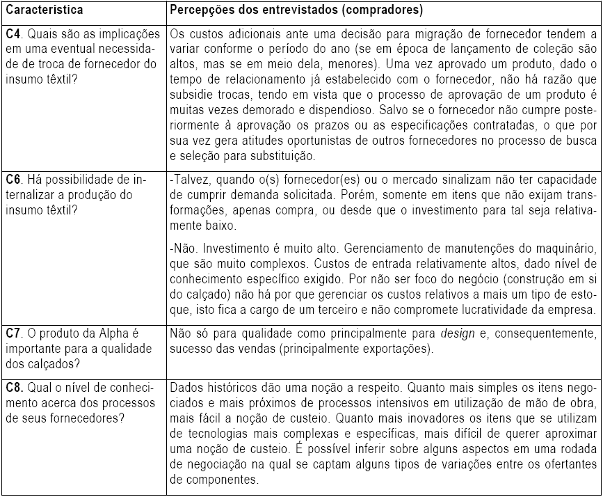 Com relação às demais características, nas quais se pode atribuir baixo poder ao comprador, observam- se: C1) baixo índice de monopolização tem por definição a contrapartida de alto índice de concorrência, ou seja, de mais empresas e baixas barreiras a entradas; C3) alteração de posicionamento, busca de produtos diferenciados para sobrevivência, o que diminui o poder tendo em vista a necessidade de customizações e o abandono de padrões que poderiam se facilmente substituídos em qualquer fornecedor a qualquer instante. Evidências encontradas indicam a dependência da indústria calçadista de seus fornecedores no quesito inovação tecnológica, pois estas inovariam apenas em design; C4) os custos da mudança são altos, em especial para quem trabalha com moda e diferenciação, e as alianças são justamente mais transacionais que estratégicas, ou seja, competitivas (notadamente perceptível junto aos compradores da Alpha, onde é mencionado o fator tempo de relacionamento e a sensibilidade à troca em épocas de lançamento); C6)Schneider, Diehl e Hansen (2011) demonstraram existência de ameaça concreta à integração vertical na ótica Porteriana para o cluster do RS. Apesar disto, é importante ressalvar duas questões: i) uma das empresas analisadas naquele estudo com alto nível de verticalização é compradora da unidade objeto de análise deste estudo, subentendendo-se, assim, esta não ter interesse em integrar tal componente à sua operação; ii) essa mesma empresa parece buscar uma vantagem de custos, o que não é o caso dos compradores da Aplha; iii) a outra empresa que é altamente desintegrada, executou a ameaça em operações de cunho logístico, mantendo operações de manufatura em níveis desintegrados. Desta maneira, segue-se o que é encontrado nos estudos, em especial ao de Dal-Soto (2004), que retrata que o processo de desverticalização praticado pelos calçadistas para dedicação maior à montagem e à marca permitiu especialização crescente dos fabricantes de componentes, o que por sua vez demonstrou aos calçadistas ser mais em conta transacionar no mercado do que gerir os custos de improdutividade e carregamentos dos estoques. Também em função do investimento inicial para este tipo de negócio, é possível inferir baixa ameaça à integração vertical, o que é notadamente reconhecido nos compradores da Alpha; C7) essencialidade reconhecida do produto da Alpha para o sucesso das vendas de seus principais compradores (FORTE; MOREIRA, 2008); C8) não se verifica por parte dos compradores da Alpha conhecimento profundo e sólido acerca dos processos de seu fornecedor de insumo têxtil, ainda mais pela predominância de produtos diferenciados e mais complexos, retirando assim qualquer possibilidade de compensação para C1) (ABBEELE; ROODHOOFT; WARLOP, 2007).