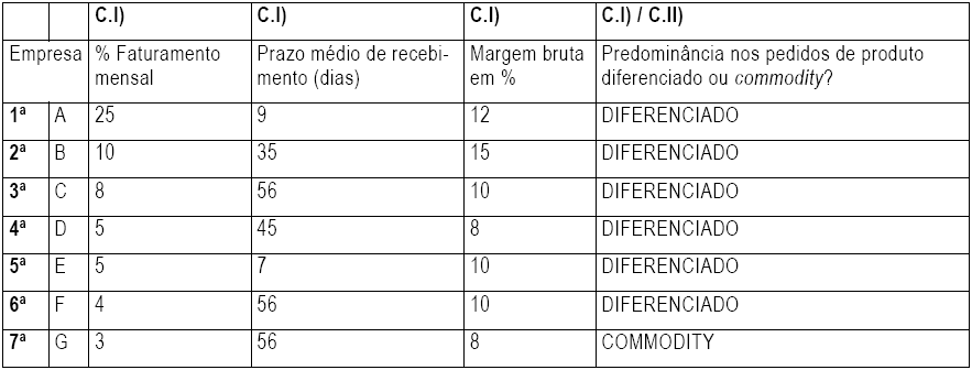 Nas informações extraídas da contabilidade e do financeiro da Alpha, verifica-se que: i) dos sete principais compradores, apenas em um predomina componente de baixo valor agregado; ii) em linhas gerais ocorrem baixas margens, mas que ainda são melhores que as praticadas para produtos mais simples, que possuem margem bruta menor que 8%; iii) concedem-se prazos médios de recebimento bem alongados; iv) um comprador sozinho absorve 25% das vendas e é o que paga mais rapidamente. A divulgação da localização dos compradores não foi permitida pela empresa.