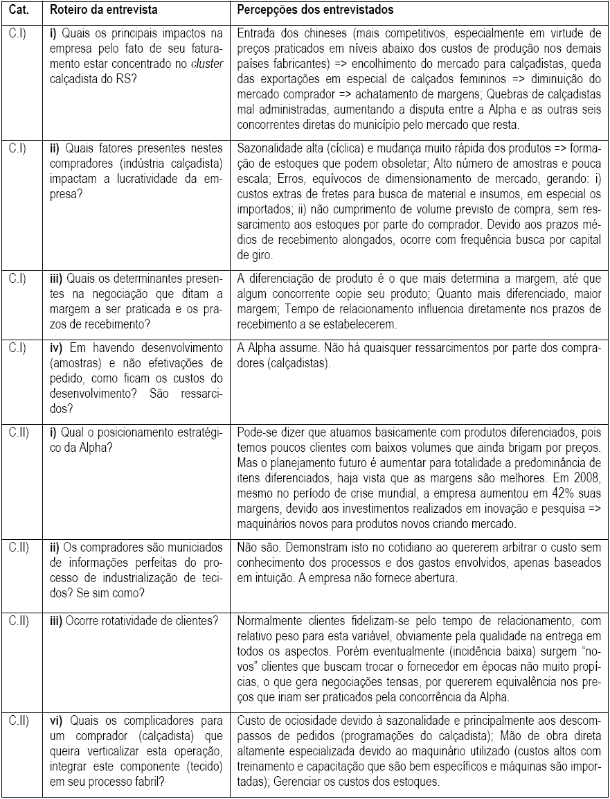 Na segunda etapa prosseguiu-se com as entrevistas semiestruturadas que permitem ao pesquisador entender e captar a perspectiva dos agentes (ROESCH, 2010). “[...] as entrevistas também são fontes essenciais de informações para os estudos de caso. As entrevistas são conversas guiadas, não investigações estruturadas” (YIN, 2010, p.133). Foram realizadas entrevistas com o gerente financeiro, o contador e o gerente de planejamento, para captar a percepção no tocante aos efeitos que seus compradores podem gerar na lucratividade e no posicionamento da Alpha. Também foram realizadas entrevistas com os gestores de compras das quatro maiores compradoras (que absorvem quase 50% das vendas mensais). As entrevistas nos compradores refletem a 4ª, 6ª, 7ª e 8ª características da taxonomia de Porter (2004): C4) custos de mudança; C6) possibilidade de integração; C7) importância do produto têxtil na qualidade dos produtos do comprador; C8) informação do comprador sobre o fornecedor. Utilizou-se desse procedimento para avaliar aquelas características em que havia risco viés de observador. Utilizaram-se estudos setoriais, uma vez que não há avaliações desta temática (poder dos compradores) específica da relação entre têxtil e calçadista no RS, apenas de toda a cadeia de componentes. As entrevistas despenderam, no total, cerca de 15 horas, sendo registradas por anotações autorizadas pelos entrevistados.