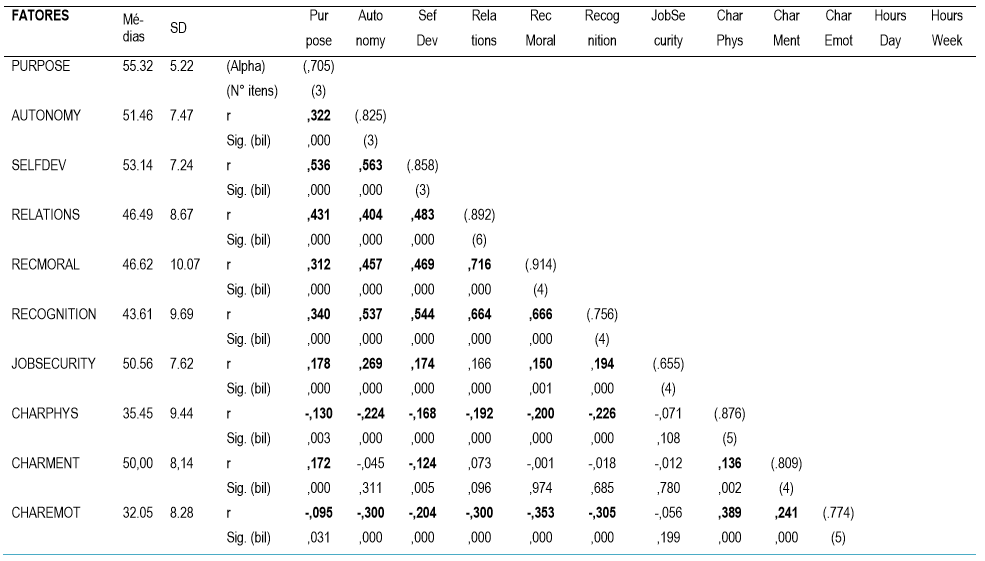 Pode-se observar também correlações fracas - negativas - entre carga física e todas as características de trabalho (-0,130; -0,224; -0,168; -0,192; -0,200 e -0,226, p <0,000), indicando claramente que eles são fatores consistentes de determinação da QVT. Por outro lado, há uma fraca correlação - positiva - entre Carga Mental e Propósito (0,172, p <0,000), o que indica claramente que há duas maneiras possíveis para entender a relação entre esses fatores de QVT. No entanto, há uma correlação - negativa - um pouco fraca, mas significativa, entre Carga Mental e Desenvolvimento Profissional (-0,124, p <0,000).