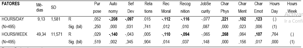 Há ainda correlações fracas - negativas - entre carga emocional e todas as características de trabalho (0,095; -0,300; -0,204; -0,300; -0,353 e -0,305, p <0,000), indicando claramente que eles são fatores consistentes na determinação da QVT. Além disso, existem correlações fracas - negativas - entre horas trabalhadas por dia e por semana, e os fatores de características do trabalho e das relações, tais como autonomia, retidão moral e reconhecimento. No entanto, existem correlações fracas - positivas - entre as horas trabalhadas e as cargas de trabalho, indicando claramente que quando as horas de trabalho diminuem, as cargas de trabalho diminuem; e quando as horas de trabalho aumentam, as cargas de trabalho também aumentam, como preconizado no modelo em estudo.