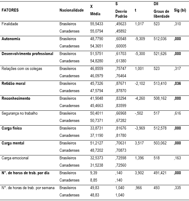 Para saber se os professores brasileiros avaliam os fatores de QVT diferentemente dos professores canadenses, calculou-se a diferença de médias dos fatores utilizando o teste t para amostras independentes. A Tabela 3 apresenta as estatísticas descritivas para os dois grupos e o teste t para cada fator. Quando o índice de significação bilateral ou p foi menor do que 5% para todos os fatores, rejeitou-se a hipótese nula (Ho) de que as duas amostras são iguais, e aceitou-se a hipótese alternativa (Ha) de que as amostras de professores brasileiros e canadenses são diferentes para sete fatores de QVT.