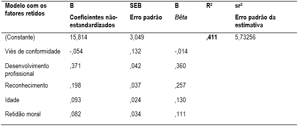 Uma análise de regressão linear foi realizada, controlada pela tendência desejabilidade social. As variáveis que foram escolhidas para a análise foram as seguintes: sexo, idade, finalidade do trabalho, desenvolvimento profissional, retidão moral, reconhecimento e relações com os colegas. A análise de regressão linear, passo a passo, revela que as variáveis que melhor explicam os índices de autonomia são: oportunidades de desenvolvimento profissional, reconhecimento, idade e retidão moral. O modelo de regressão obtido está apresentado na Tabela 4.