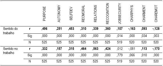 A fim de entender melhor a relação entre as características do trabalho, as características das relações de trabalho, a sensação de segurança no emprego e os diferentes tipos de carga de trabalho que estariam associados a um trabalho que tem sentido, calcularam-se as correlações entre estas variáveis. Em geral, a Tabela 2 mostra que quase todos esses fatores estão significativamente correlacionados com indicadores de sentido do trabalho como preconizado pelo modelo de pesquisa adotado (Morin, 2008).