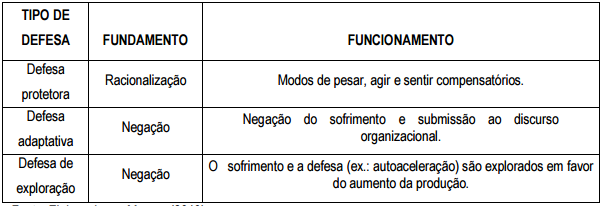 Mendes (2007) identifica as estratégias de defesa como sendo de proteção, de adaptação e de exploração. As defesas de proteção se utilizam dos processos de racionalização e alienação das reais causas do sofrimento, mantendo inalterada a situação vigente, manifestam-se, não raro, pela resignação, apatia, passividade, conformismo e individualismo. Já as de exploração e adaptação são manifestadas por meio de negação do sofrimento e da submissão aos desejos organizacionais, resultando em atitudes de desconfiança, isolamento, banalização das situações desagradáveis, etc. (MENDES, 2007; LANCMAN; SZNELWAR, 2011; DEJOURS; ABDOUCHELI; JAYET, 1994). O Quadro 1 esclarece o fundamento e o funcionamento dessas estratégias: