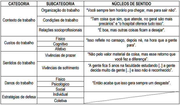 A seguir são apresentados e discutidos os núcleos de sentidos definidos a partir das entrevistas com os fisioterapeutas, conforme as categorias avaliadas no ITRA de Mendes e Ferreira (2007).