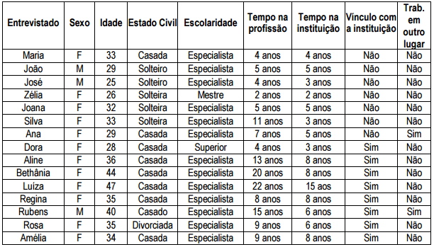 Como instrumento de coleta de dados, foram realizadas entrevistas semiestruturadas, individuais, com profissionais escolhidos pelo critério de acessibilidade, realizadas no período de setembro a outubro de 2015. O número de entrevistados está dentro do indicado por Mendes (2007, p. 71), ao recomendar “[...] o número de no mínimo seis participantes e no máximo doze”, para cada grupo. Foi esclarecido a todos os participantes que o material das entrevistas seria utilizado somente para fins da pesquisa, e que suas identidades, bem como a instituição, seriam mantidos em sigilo. Os entrevistados são reportados por pseudônimos. Com 15 entrevistas atingiu-se a saturação, em conformidade com a estimativa empírica de Thiry-Cherques (2009).
