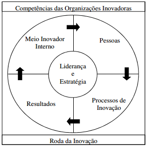 A organização inovadora pode ser identificada mediante a análise das competências essenciais que uma organização deve possuir para ser inovadora, as quais representam as condições necessárias para que a inovação ocorra (HARGADON; SUTTON, 2000; MACHADO, 2007). Uma competência essencial é definida como um conjunto de fatores que contribuem para a prosperidade ou sucesso em longo prazo de uma organização (CHRISTENSEN, 1997; HAMEL; PRAHALAD, 1994). Considerando a definição de organização inovadora, pode- se definir competência inovadora como um conjunto de fatores que contribuem para que uma organização torne e mantenha com sucesso uma organização inovadora. O Fórum de Inovação FGV/EAESP (2014) traz como proposta de competências inovadoras: liderança e intenção estratégica; meio inovador interno; pessoas; processos de inovação; e resultados. Estas competências formam o modelo de diagnóstico da organização inovadora, chamada de Roda da Inovação (Figura 1), que representa uma visão dinâmica das organizações inovadoras.