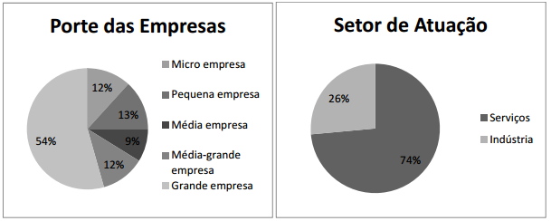 Para verificar as características das empresas estudadas, foi realizada uma estatística descritiva com o porte e setor de atuação. No Gráfico 1, pode-se observar que boa parte das empresas (54%) são grandes empresas, ao passo que os demais portes estão bem distribuídos na pesquisa. Essa diversidade reflete as características das empresas filiadas à FNQ e IPEG. A maior participação das grandes empresas pode significar um reflexo do perfil inovador das grandes e pequenas empresas, uma vez que as grandes empresas comumente possuem um processo de inovação mais estruturado (FRANCO; HAASE, 2010), o que pode ter influenciado a participação na pesquisa; e as pequenas empresas, processos de inovação mais informais (FRANCO; HAASE, 2010). Em relação ao setor de atuação, nota-se uma maior concentração em empresas de serviços (74%), o que também evidencia uma característica das empresas filiadas à FNQ e IPEG e também representa uma tendência de distribuição das empresas no país.