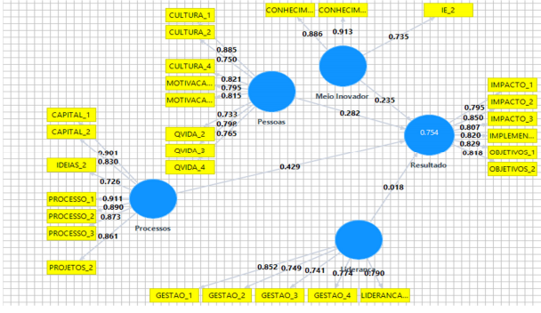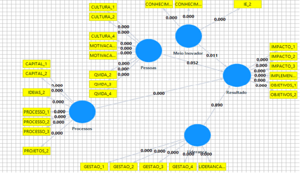 A regressão permitiu suporte estatístico para afirmar a influência positiva das competências meio inovador, pessoas e processos sobre o resultado. Para reforçar os achados, foi elaborada uma modelagem de equações estruturais, com as cargas e p-values dispostos nas Figuras 2 e 3, respectivamente.