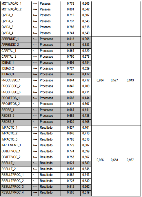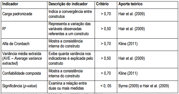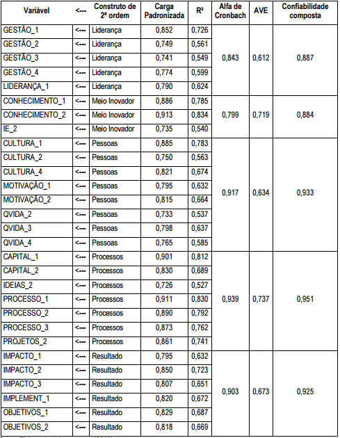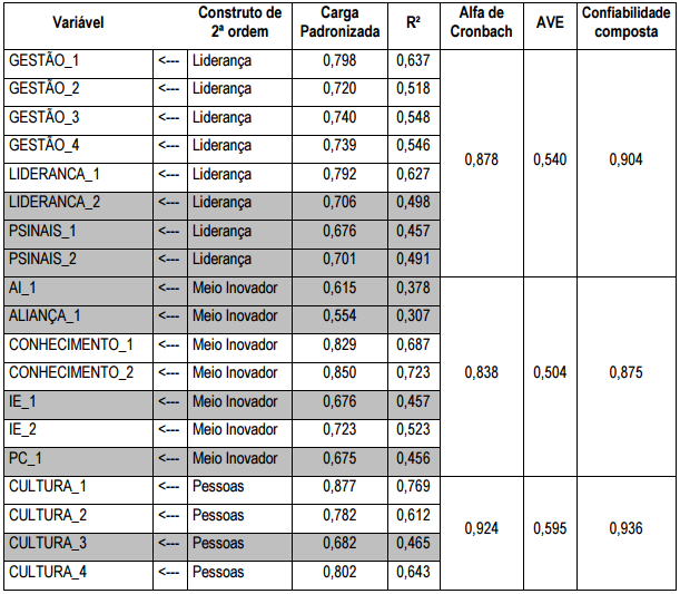 Após ser rodada uma primeira análise fatorial confirmatória, houve a necessidade de exclusão de algumas variáveis, o que permitiu uma adequação do modelo utilizado aos propósitos desta pesquisa. Esta adequação está disposta na Tabela 2.