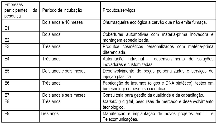 As empresas participantes da pesquisa foram selecionadas de acordo com os seguintes critérios: a) período de incubação compreendido entre dois e três anos; b) estágio de desenvolvimento desde a sua admissão na ITG até o momento da pesquisa; e c) atividades desenvolvidas que tenham permitido se obter resultados relevantes, de maneira a possibilitar a obtenção de dados relevantes para a pesquisa.