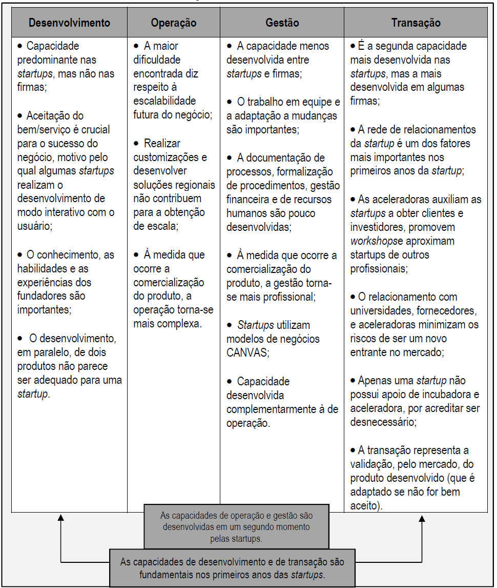Constata-se, assim, que mesmo que a capacidade tecnológica da firma seja um importante componente do processo de inovação, ela não explica como as firmas transformam as invenções internas em transações de mercado e, consequentemente, em inovações (ZAWISLAK et al., 2013). Por exemplo, para produzir e, posteriormente, comercializar os novos produtos e/ou processos desenvolvidos internamente, as startups necessitam de capacidades de operação, de gestão e de transação para completar o seu processo de inovação.
