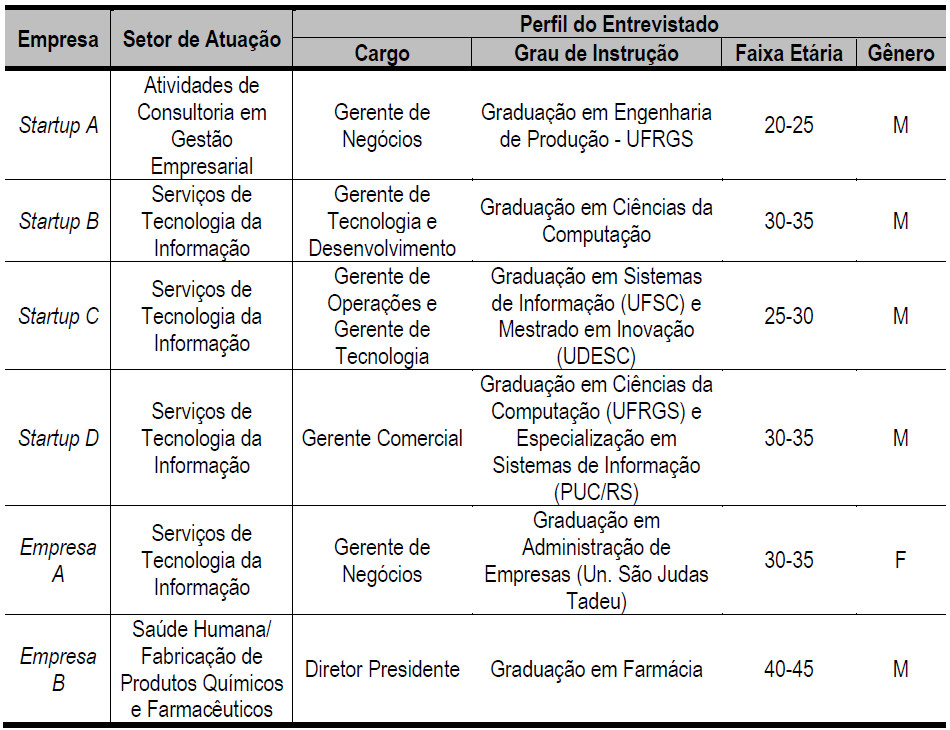 Optou-se, assim, por realizar um estudo com seis empresas localizadas em Porto Alegre, Rio Grande do Sul: quatro startups e duas firmas. Entre as startups, definiu-se que seriam entrevistadas três em fase de pré-comercialização do produto/serviço desenvolvido e uma em fase de comercialização do produto (em estágio de transição para firma). Como firmas, foram selecionadas aquelas empresas com uma trajetória de startup, mas que, atualmente, já possuem um modelo de negócios definido e escalável, a partir do qual estão gerando lucro. O Quadro 1 sintetiza as informações dos entrevistados.