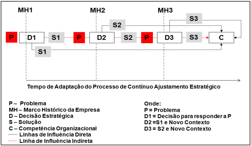 A partir do conteúdo desenvolvido por Teece et al. (1997) e Miles et al. (1978), considera-se que é possível determinar um período de tempo de adaptação de competências organizacionais e capacidades dinâmicas no processo de contínuo ajustamento para um estudo mais detalhado sobre o comportamento estratégico. Na figura apresentada, determinou-se o tempo inicial no marco histórico 1 (MH1) e final após o marco histórico 3 (MH3). Nestes períodos, por meio da caracterização de um problema (P), de decisões (D1, D2 e D3) para tratá-lo, e soluções (S1, S2 e S3) implementadas é possível demonstrar o tempo de adaptação da Competência Organizacional (C) no processo de contínuo ajustamento estratégico.