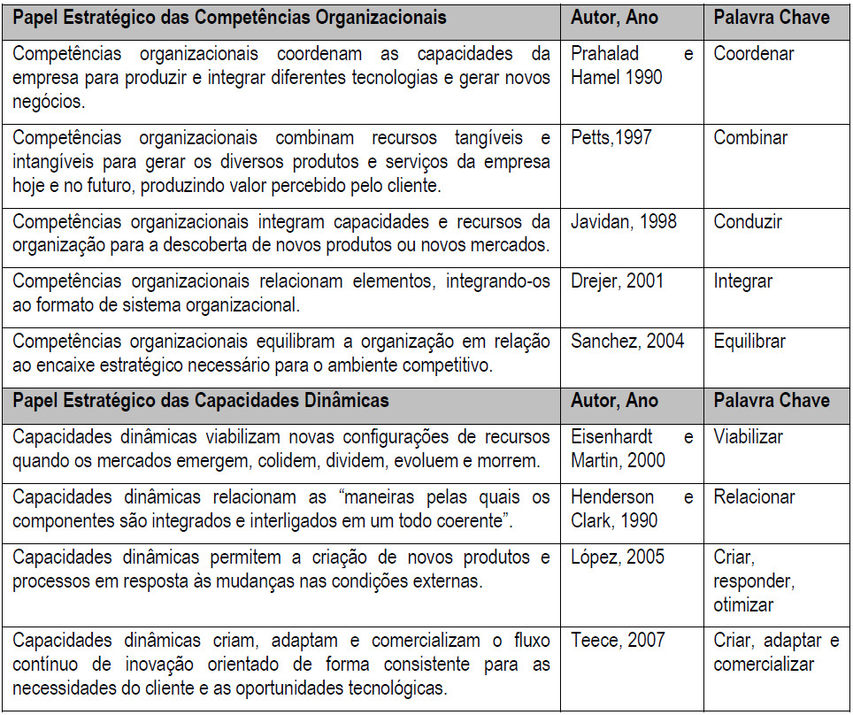 Para a finalidade desse estudo, apresentam-se os seguintes papéis estratégicos: (1) competências organizacionais integram as capacidades e os recursos da organização tendo os elementos constitutivos originados na estratégia e (2) capacidades dinâmicas criam, adaptam e reconfiguram os recursos internos para atender aos requisitos do processo de contínuo ajustamento estratégico.
