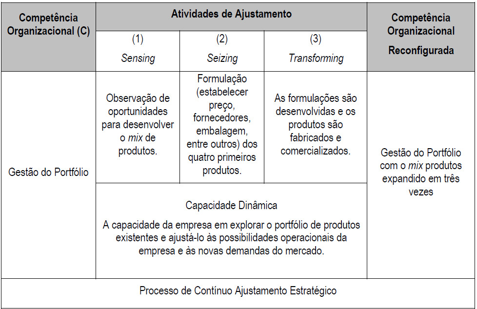 Retomando o exemplo da Empresa X, no Problema (P) de Empreendedorismo, a Competência Organizacional (C) Gestão de Portfólio de Produtos é possível identificar com o passar do tempo a atuação de capacidades dinâmicas a partir dos três grupos de atividades de ajustamento (Sensing, Seizing e Transforming). Estas atividades ocorrem ao longo do processo de ajustamento estratégico da empresa e colaboram para a reconfiguração da Competência Organizacional. Percebe-se que o tempo de adaptação de capacidades dinâmicas ao processo de contínuo ajustamento estratégico está relacionado à possibilidade de reconfiguração da base de recursos da organização, conforme apresentado no Quadro 2.