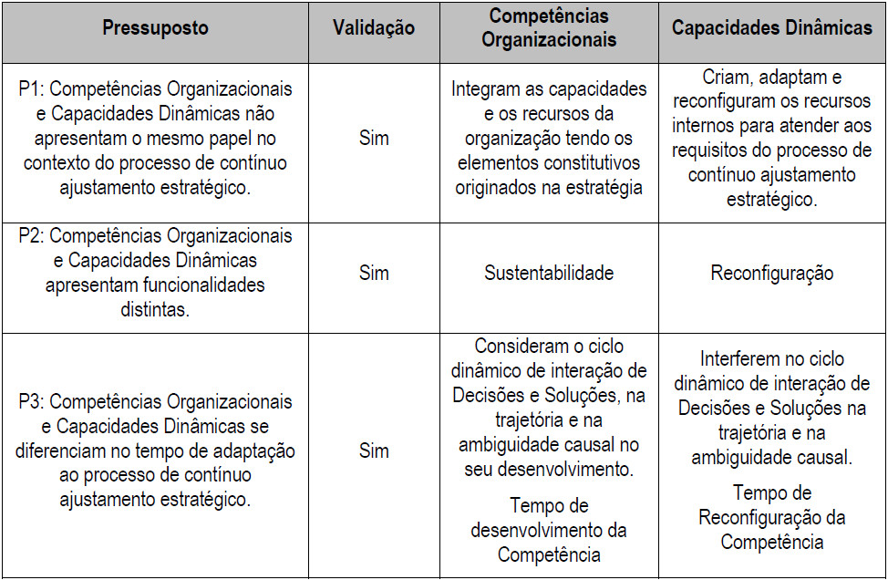 O primeiro pressuposto sugere que competências organizacionais e capacidades dinâmicas não apresentam o mesmo papel no contexto do processo de contínuo ajustamento estratégico.