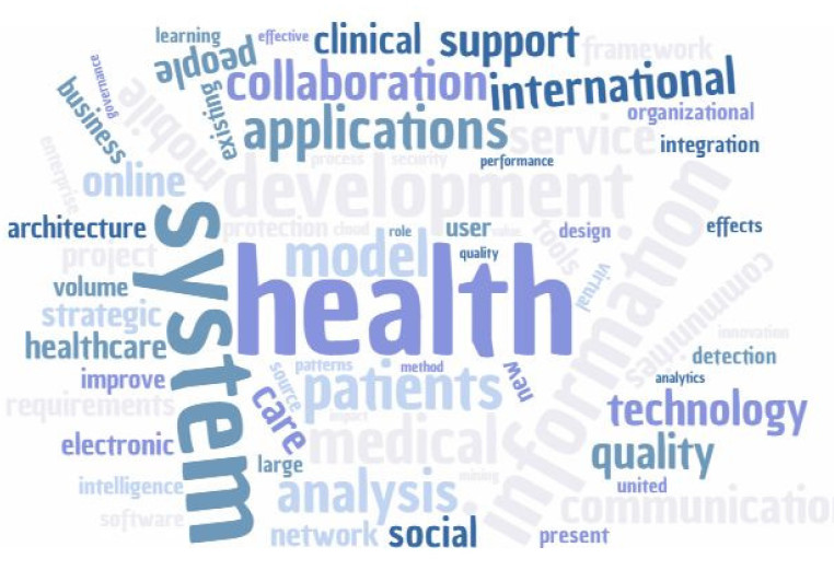 A Tagcloud foi elaborada com o apoio do software de análise qualitativa MaxQDA versão 11.1.2, excluindo as palavras sem significado (conjunções, artigos, adjetivos, etc.) e as palavras de busca da seleção da amostra de artigos (Big Data, Knowledge Management e Knowledge Sharing). As palavras destacadas com maior tamanho de fonte indicam uma maior importância do termo ranqueado a partir da frequência em que o termo foi encontrado. Como pode ser visto, as palavras de maior destaque corroboram com a análise dos tópicos discutidos nessa seção (4.2), especialmente nos tópicos relacionados à aplicação de Big Data nos estudos de Saúde. Também se destacam os aspectos tecnológicos, como infraestrutura, arquitetura e desenvolvimento de sistemas. A análise dos termos extraídos também pode ser útil em atribuir tendências para as pesquisas futuras sobre esses temas.