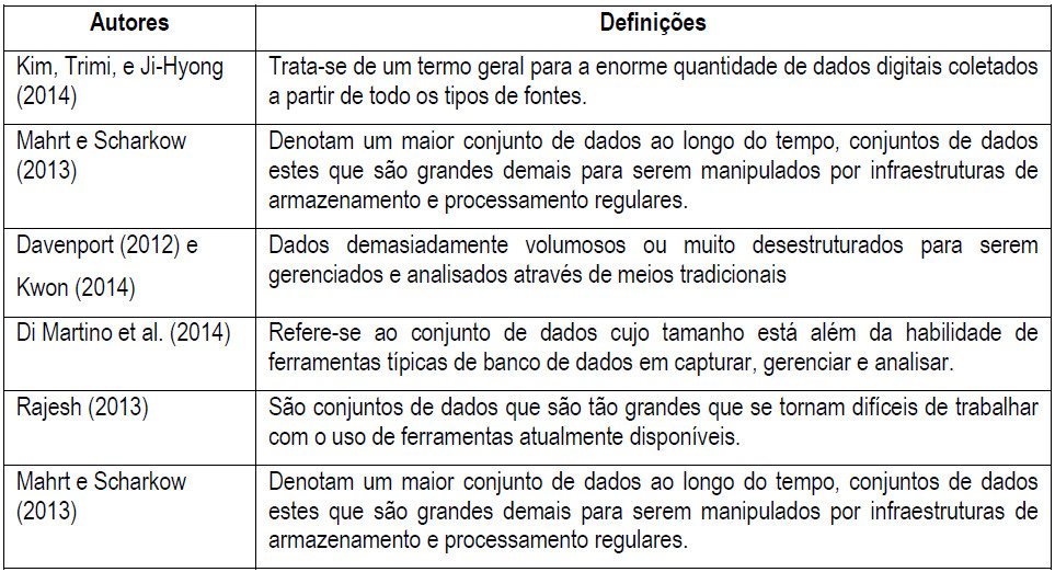 Baseando-se no Quadro 1, é possível notar uma similaridade nos conceitos, que podem ser sintetizados como sendo um grande volume de dados estruturados ou não, de fontes diversas, que devem ser gerenciados e analisados de forma peculiar.