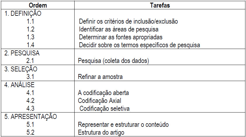 A escolha desses passos se justifica pela dificuldade de estruturação e apresentação uma revisão da literatura dos resultados da pesquisa, de forma pertinente, trazendo relevância e qualidade aos resultados, conforme destacam Webster e Watson (2002). O Quadro 2 ilustra os cinco passos do método proposto.