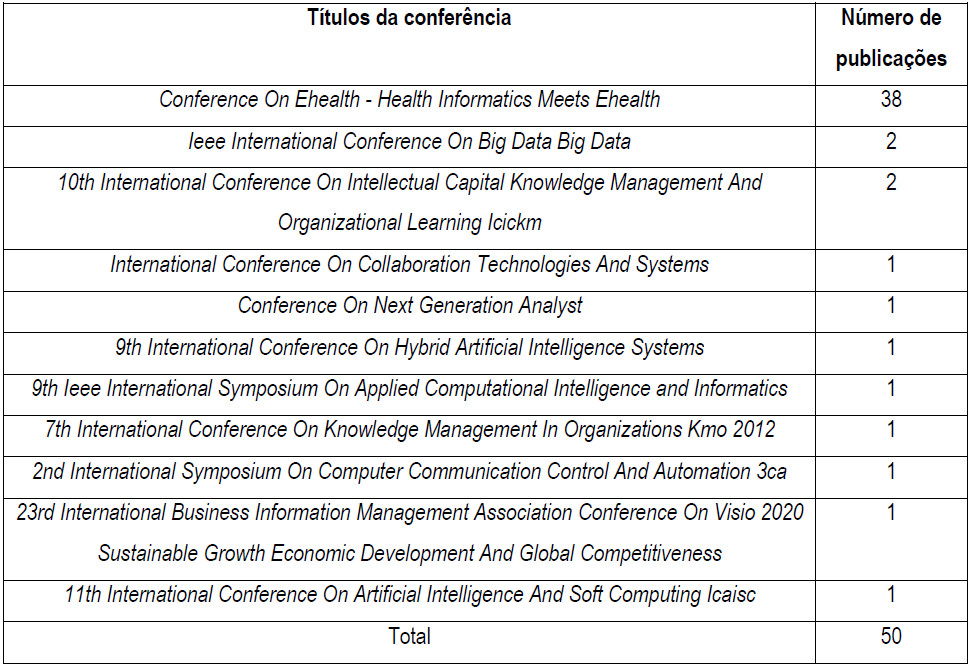 No Quadro 4, os artigos são agrupados segundo as conferências internacionais encontradas na pesquisa da base Web of Science. Observa-se que a maioria dos artigos, 38(trinta e oito) dentre as 50 (cinquenta), referem-se a assuntos de saúde, o que indica o crescimento de importância do estudo da Gestão do Conhecimento e do Big Data para essa área, indo ao encontro do que foi destacado no referencial teórico.