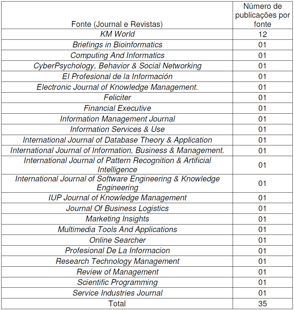 No Quadro 5 estão relacionados os periódicos cujos artigos foram publicados, destaca-se a revista “KM World” que possui 12 (doze) artigos. Acredita-se que essa concentração se deve ao fato de a mesma ser específica para o tema gestão do conhecimento.