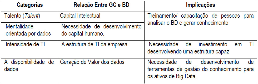 Esse estudo verificou as conexões naturais existentes entre Gestão do Conhecimento e Big Data. Kabir e Carayannis (2013) evidenciam que esta conexão é clara, mas por se tratar de um tema novo, o desafio está em encontrar as maneiras de relacionar a Gestão do Conhecimento em um contexto de grande volume de dados (ERICKSON; ROTHBERG, 2014).
