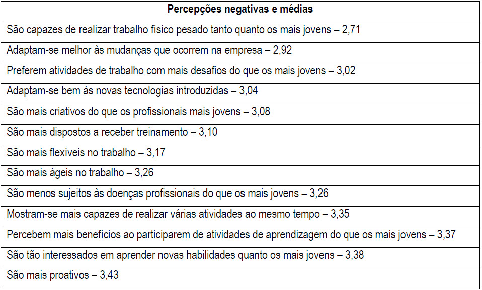 Na pesquisa de Taylor e Walker (1998), os gestores respondentes tendiam a pensar na incapacitação do profissional mais velho ao trabalho físico pesado, na dificuldade de serem treinados e no desinteresse em atividades de aprendizagem. Maior lentidão no trabalho, desorganização e problemas de relacionamento foram percepções negativas associadas aos mais velhos identificadas na pesquisa de Roscigno et al. (2007). Pontos de tensão entre profissionais de faixas etárias diferentes também ficaram evidentes na pesquisa de Brooke e Taylor (2005). Para esses autores, os profissionais mais velhos causam tensão no ambiente de trabalho quando respondem a profissionais mais jovens que ocupam cargos de supervisão. Para Henkens (2005), as percepções negativas estariam, ainda, associadas à adaptabilidade às novas tecnologias e às mudanças nas empresas.